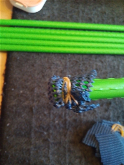 まず、園芸用棒の下に滑り止めシートを小さくカットし、輪ゴムで仮止めし、紐でしっかり固定します。